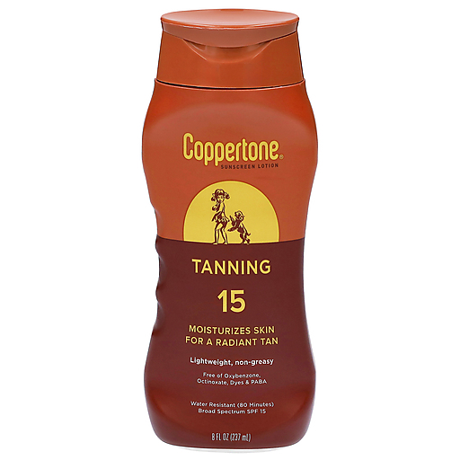 Make the most out of your time in the sun with Coppertone Tanning Sunscreen Lotion. Love the sun and love your skin even more with a lightweight SPF 15 sunscreen lotion formula that won't make your skin feel greasy. This Broad Spectrum sunscreen is water resistant (80 minutes), and is free from Dyes, PABA, and Oxybenzone. This Coppertone sunscreen SPF 15 formula is enriched with Vitamin E to keep skin feeling moisturized. Coppertone Tanning Sunscreen Lotion is perfect for everyday use, whether you're relaxing on a tropical beach, by the pool or in your backyard. Each sunscreen Coppertone creates follows a tradition of trusted, quality sun protection products. Coppertone has been providing continuous innovation for more than 75 years, and is voted the most trusted sunscreen brand.* Use and reapply Coppertone Tanning Sunscreen Lotion as directed.