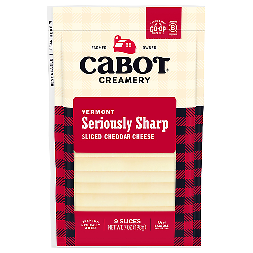 Enjoy the ultimate sharp cheddar experience with our farmers' Seriously Sharp White Cheddar Cheese Slices. Pre-sliced to make your cheddar cravings even easier to satisfy, this complex premium cheddar is expertly aged until it reaches the perfect balance of bold bite and nutty tanginess. Piled onto a hearty turkey sandwich, Cabot's Seriously Sharp Slices bring bold cheddar flavor to serious sandwhich conniousuers. Gluten free with zero grams of lactose, enjoy Cabot Seriously Sharp Slices any time you crave the bold flavor of the World's Best Cheddar.