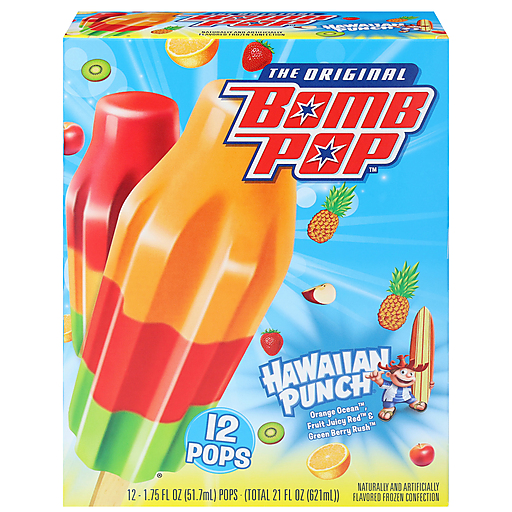 Bomb Pop Hawaiian Punch® invites Fruit Juicy Red®, Green Berry Rush®, & Ocean Orange® into your mouth in the iconic Bomb Pop shape. Pretty much an insane surprise party for your taste buds. Distinctly Different, Totally Awesome. With 12 pops in each box, you can share with friends or, with just 40 Calories in each Pop, keep them all for yourself. We don't judge. The best things are not one thing. Iconic and delicious, with multiple flavors in every pop, Bomb Pop is not one thing. Pick up your favorite flavor combination today!