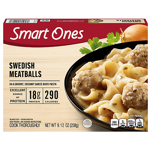 The easy way to make deliciously smart choices. Smart Ones Swedish Meatballs offers a quick meal solution for lunch or dinner. Our meatball dish features Swedish meatballs in a savory, creamy sauce over pasta. Each meal contains 290 calories, 18 grams of protein and 8 WW Points® per serving. Our savory meatballs are an excellent source of protein. Ideal for an easy dinner, our convenient meal includes a microwave tray for effortless meal preparation. Cook as directed. Keep our frozen food in the freezer until ready to prepare and cook thoroughly.