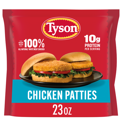 A chicken sandwich staple loved by kids and adults, Tyson Frozen Chicken Patties are a delicious and crispy delight. These chicken patties are fully cooked, breaded, and made with white meat chicken for a classic taste. Perfect sandwiched between two buns, top the patties with ketchup, lettuce, or any preferred toppings to make the sandwich sensational. Whether cut up to put in a salad or enjoyed as a side to a meal, these patties are made with 100% all-natural* chicken raised without added hormones or steroids**. Tyson Frozen Chicken Patties have 10 grams of protein per serving and make for a quick and easy food option. Keep frozen until ready to prepare, then cook in an air fryer, oven, or microwave according to the instructions on the back of the pack for warm chicken patties. *Minimally processed, no artificial ingredients **Federal regulations prohibit the use of added. hormones or steroids in chicken.