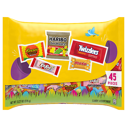 Offering five crowd pleasing favorites, these delicious assorted flavored candies are an anywhere and anytime treat perfect for stocking your pantry with a variety of sweet selections, filling up Easter candy jars for display and sharing with loved ones. With its convenient packaging, you can take this variety candy bag into the office break room, to your next road trip or to your next sporting event. This assorted bag of chocolate and fruit flavored candies includes HARIBO® GOLDBEARS® gummy candy, KIT KAT® chocolate wafer candy bars, REESE'S Miniatures peanut butter cup candy, ROLO® rich chocolate caramels candy and TWIZZLERS TWISTS strawberry flavored chewy candy. Hershey egg hunt sweets are the perfect plastic egg stuffers whether the kids are searching for eggs or the adults want to jump in, too. After collecting the eggs in baskets, hunters of all ages will be excited to try these bite size chocolate and fruit flavored candies. There may be some sharing and swapping as everyone opens their eggs, but that's what makes it so fun! If someone really loves these sweet egg hunt candies, gift them the entire bag so they have some sweet treats for the rest of the season. Easter just got a whole lot more fun with these tasty assorted candies!