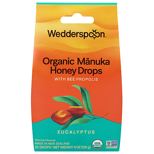 OUR RECIPE WAS DEVELOPED IN THE 1950S AND WE STILL USE IT TODAY TO FORMULATE OUR HEALTHY AND DELICIOUS WEDDERSPOON EUCALYPTUS ORGANIC MANUKA HONEY DROPS. OUR ORGANIC DROPS ARE GLUTEN-FREE, DAIRY-FREE, NUT-FREE, GMO FREE, AND DO NOT CONTAIN ANY SULPHITES, ARTIFICIAL COLORING, FLAVORING, PRESERVATIVES, OR TRANS FATS. WE BELIEVE THAT EVERYONE SHOULD BE ABLE TO ENJOY OUR SUPERIOR QUALITY, ORGANIC DROPS. INCLUDES ONE 4 OZ. BAG OF WEDDERSPOON EUCALYPTUS ORGANIC MANUKA HONEY DROPS. WEDDERSPOON SOURCES THE FINEST AND MOST PRISTINE RAW MANUKA AND GOURMET HONEY IN THE WORLD. WE OFFER NOTHING BUT THE BEST WHICH IS WHY ALL OF OUR NEW ZEALAND SOURCED GOURMET HONEYS ARE NON-GMO VERIFIED. USING SUSTAINABLE RESOURCES, OUR HONEY IS COLLECTED AND HARVESTED WITH OUR FRIENDS THE BEES IN MIND.